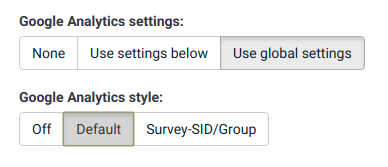 | Description | Using the global Google Analytics settings for a survey seems to be broken, the "9999useGlobal9999" token is not replaced with the actual Google Analytics tracking id. | ||||