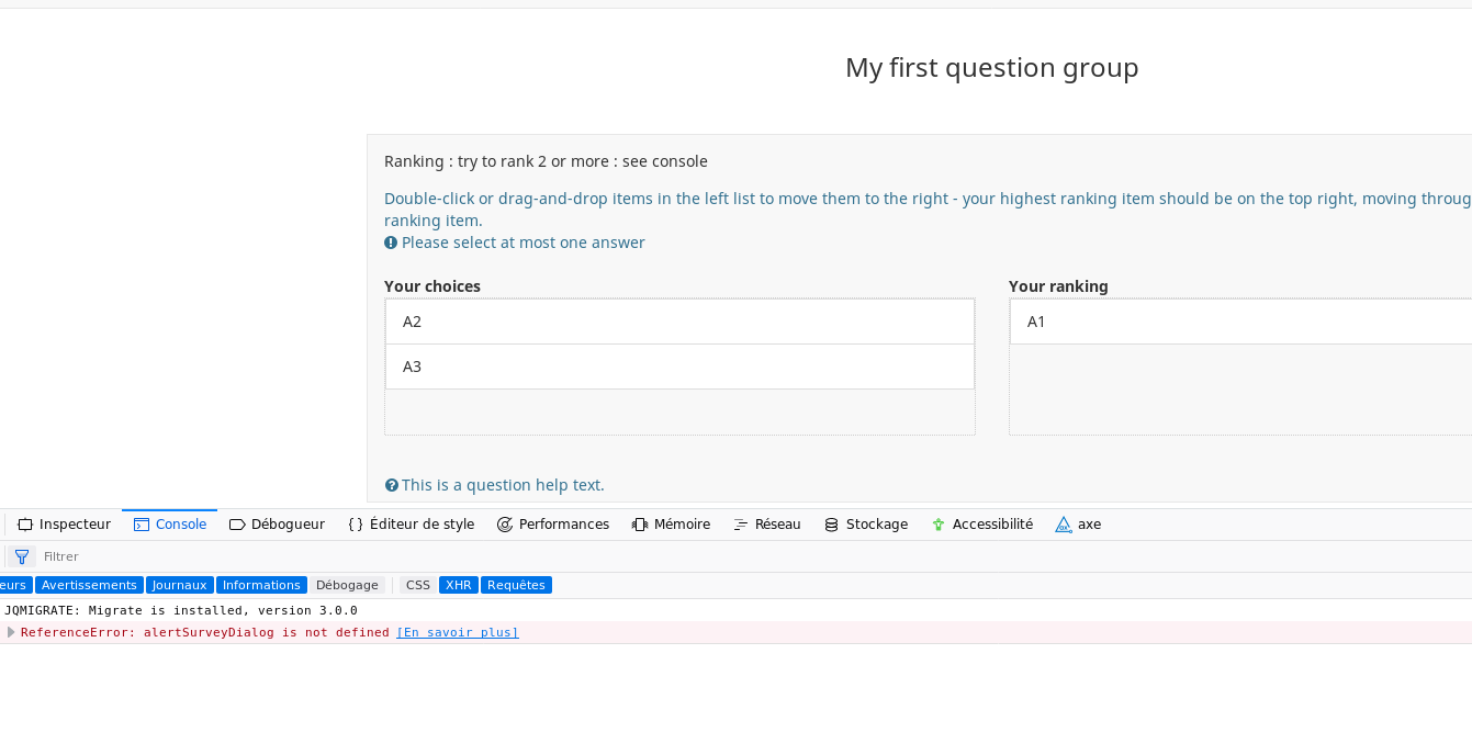| Description | In ranking question , with showpopup to true : there are no alert done | ||||