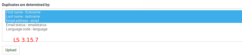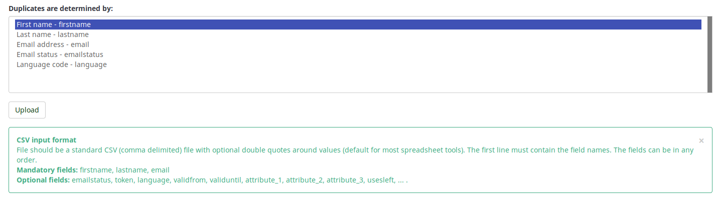 Hmm, @DenisChenu, shall we put an orange box above "Upload" in which it should be said that: "Duplicates are determined by "tokens - token" by default." Do you have any other suggestion? |