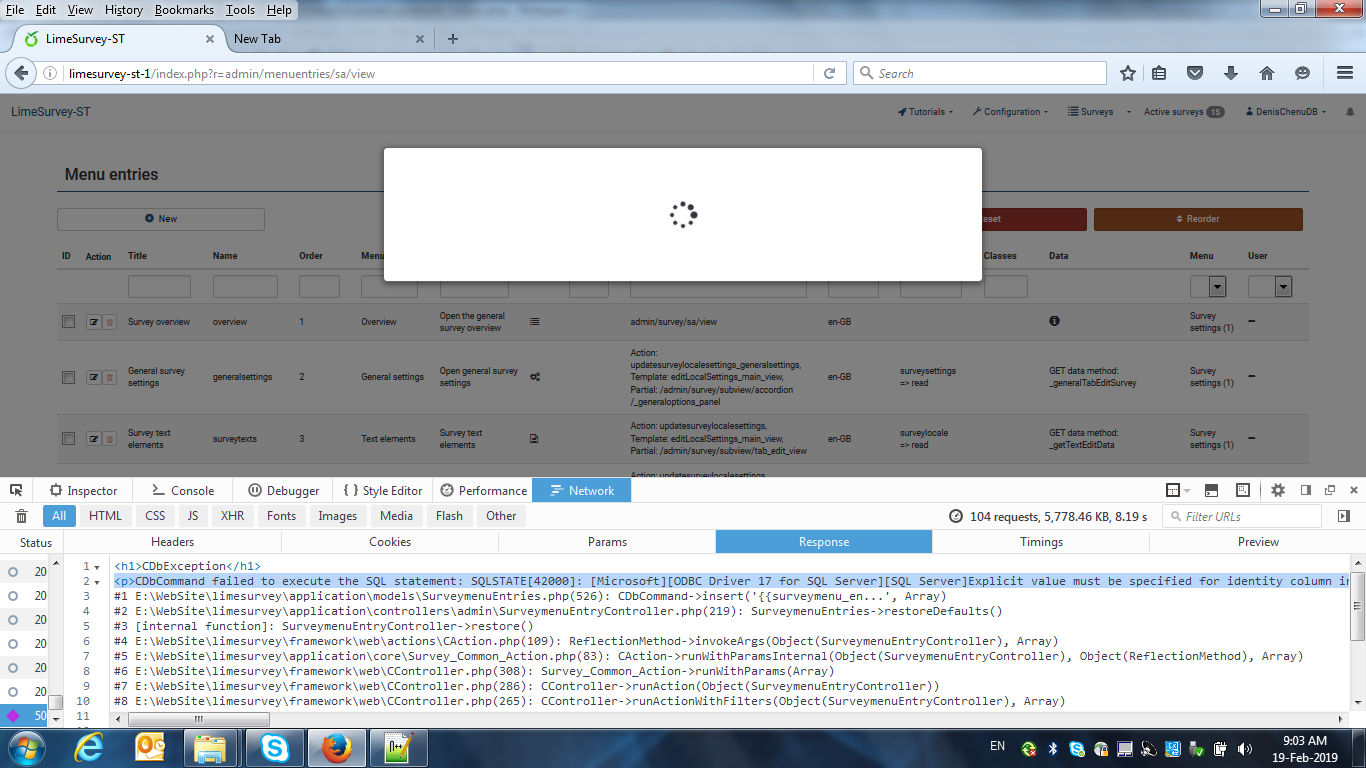| Additional Information | Even with switchMSSQLIdentityInsert : it's still an issue CDbCommand failed to execute the SQL statement: SQLSTATE[42000]: [Microsoft][ODBC Driver 17 for SQL Server][SQL Server]Explicit value must be specified for identity column in table 'lime_surveymenu_entries' either when IDENTITY_INSERT is set to ONor when a replication user is inserting into a NOT FOR REPLICATION identity column.. #0 E:\WebSite\limesurvey\framework\db\CDbCommand.php(1278): CDbCommand->execute(Array) | ||||