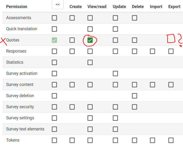 | Description | If you assign a user to a survey and only assign that user the right to view quotas (see attached screenshot), the user is not able to use the CSV export feature. I can think of two approaches: