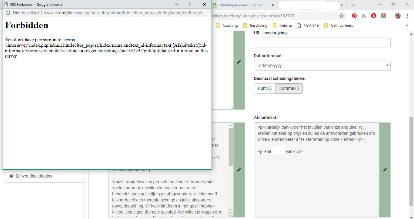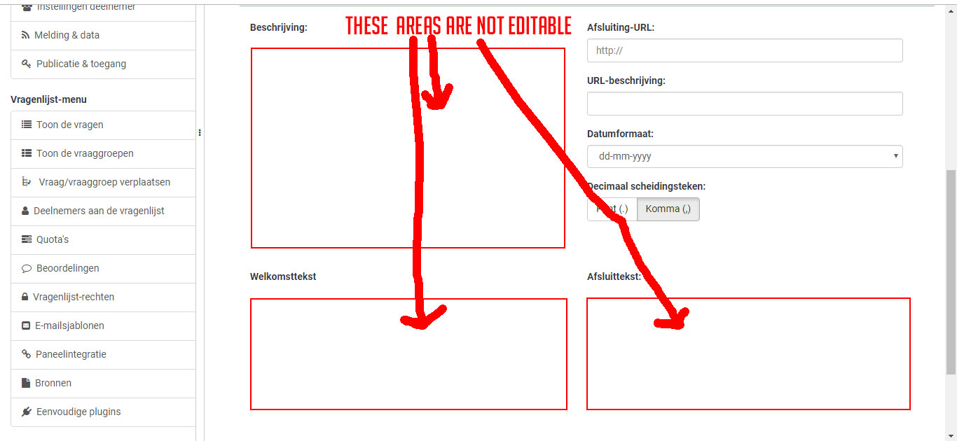 | Description | When trying to add or edit the Description, Welcome text and Closure text, the text fields are not editable. It's just white. I tried different browsers, but it is the same in all of them. (see uploaded file: #01) When I changed the "HTML editor method" in my personal account settings to "Pop-up HTML-editor" or "No HTML-editor", the problem is solved. I can edit the text then. Only the editor settings "Standard" and "Inline" gives the problem. When I try to use the popup however, It gives a "Forbidden error". The normal text field is editable though. (see uploaded file: #02) | ||||