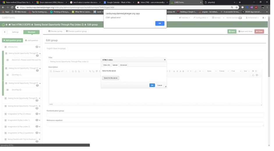 I checked on the requirements to ensure all requirements are met. This error was not present until I updated the instance of limesurvey to the latest version using comfortupdate. So unless the comfort update removed libraries, or didn't update required libraries, I doubt that the error has anything to do with the server config (unless the network administrator barred something). It would appear that the error is related to any sort of file upload. I attempted to embed an HTML5 video directly in a question, and when I used the file upload dialog box, it spits back an error "CSRF upload error". Uploading elsewhere, such as in the theme editor, causes no errors. |
