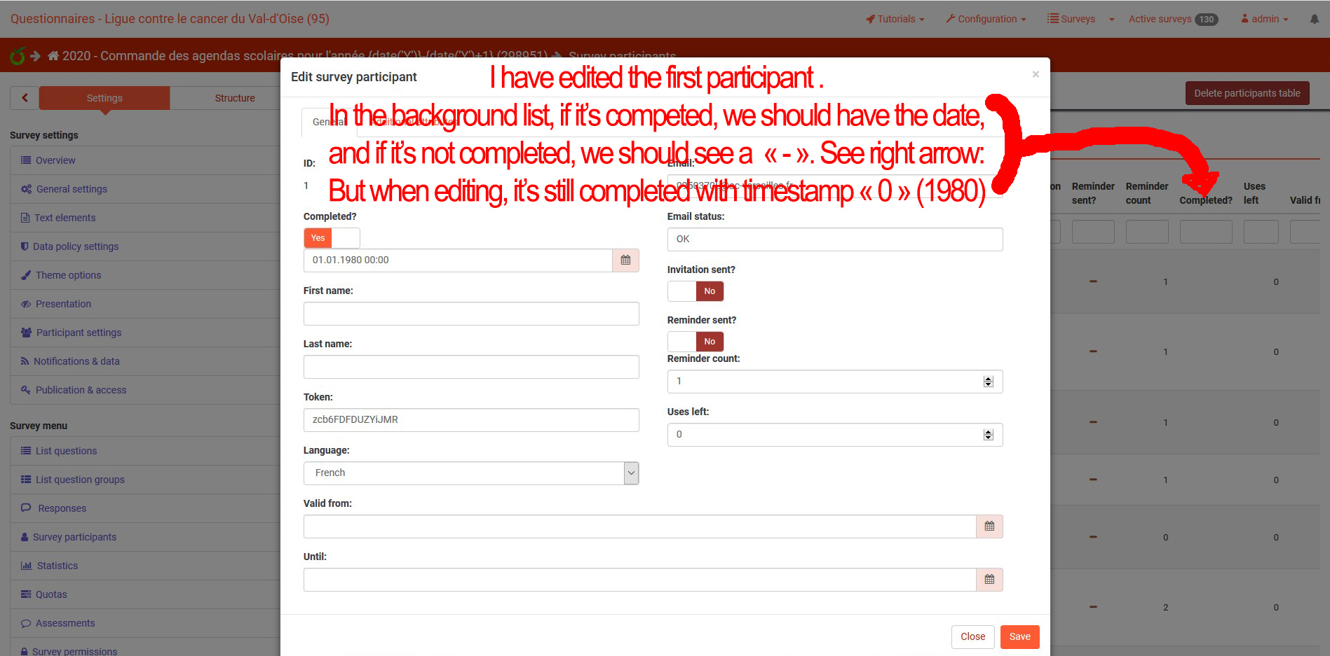 | Description | Hi! 1/ for the reminder count it's impossible to reset it to 0: the values remain the same as before; when I select the checkbox and enter "0" in the field 'reminder count' then 'Apply', I have the message "Nothing to update" (surprisingly, when I do the same with 'Uses left', it works, even with '0' value) 2/ still in the batch-edit participant menu, there is a bug with the 3 fields: 'Completed?', 'Invitation sent?' and 'Reminder sent?'. When I want to update them, if I only select the checkbox in front of them, the yes/no bouton because active and by default the value is 'No'. I was supposing that clicking then on 'Apply' would do the job but in fact it doesn't. For example with 'Completed?': when doing this, the participant doesn't appear completed any more in the list but when editing a specific participant, his survey is still 'Completed' with timesamp equal to zero (see joined file for better explanation). To really update the 'Completed' field to 'No' for all, you have to open the batch-edit munu, select one of the fields (eg. 'Completed'); then clicking on 'Yes', then clicking again on 'No' and only after 'Apply' the changes. | ||||