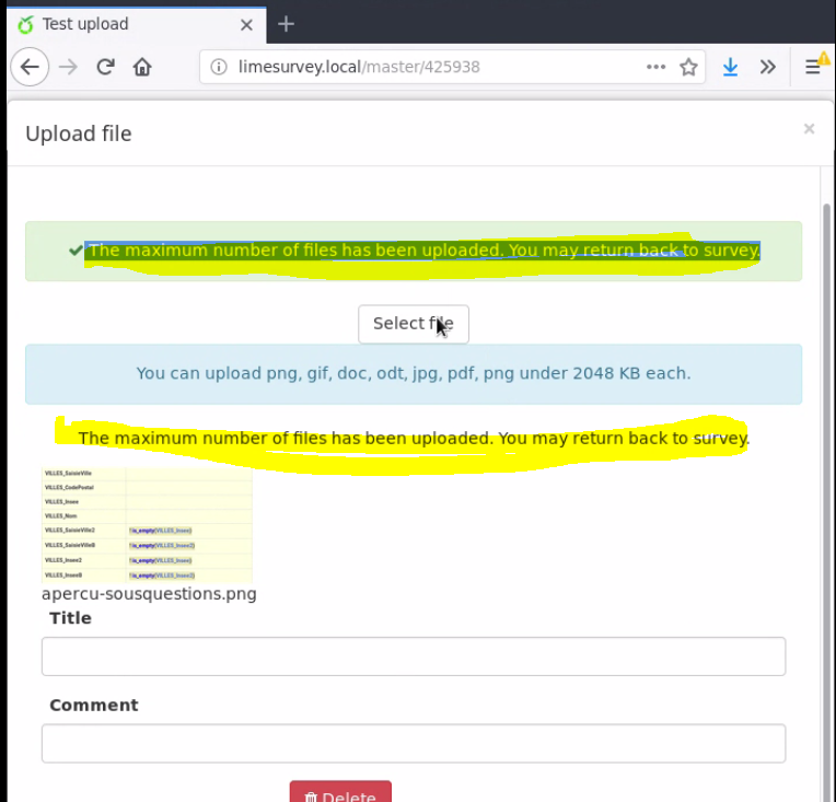 | Steps To Reproduce | Create a "file upload" question which sets a maximum of 1 file to be uploaded, execute or preview the survey and upload a file to it. | ||||