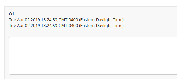 | Steps To Reproduce | 1) Upload the attached survey and ensure that AJAX Mode = No. 2) Preview the survey. 3) On the first page load, you will get an alert indicating page load and a new date will be appended to the Q1 question text. 4) Advance to group 2 - the page is loaded via AJAX where it should be a complete page reload. 5) Return to group 1. 6) There is no alert indicating a page load and a second date is inserted below the first. If AJAX were disabled (causing complete page load), there would only be one date inserted! | ||||