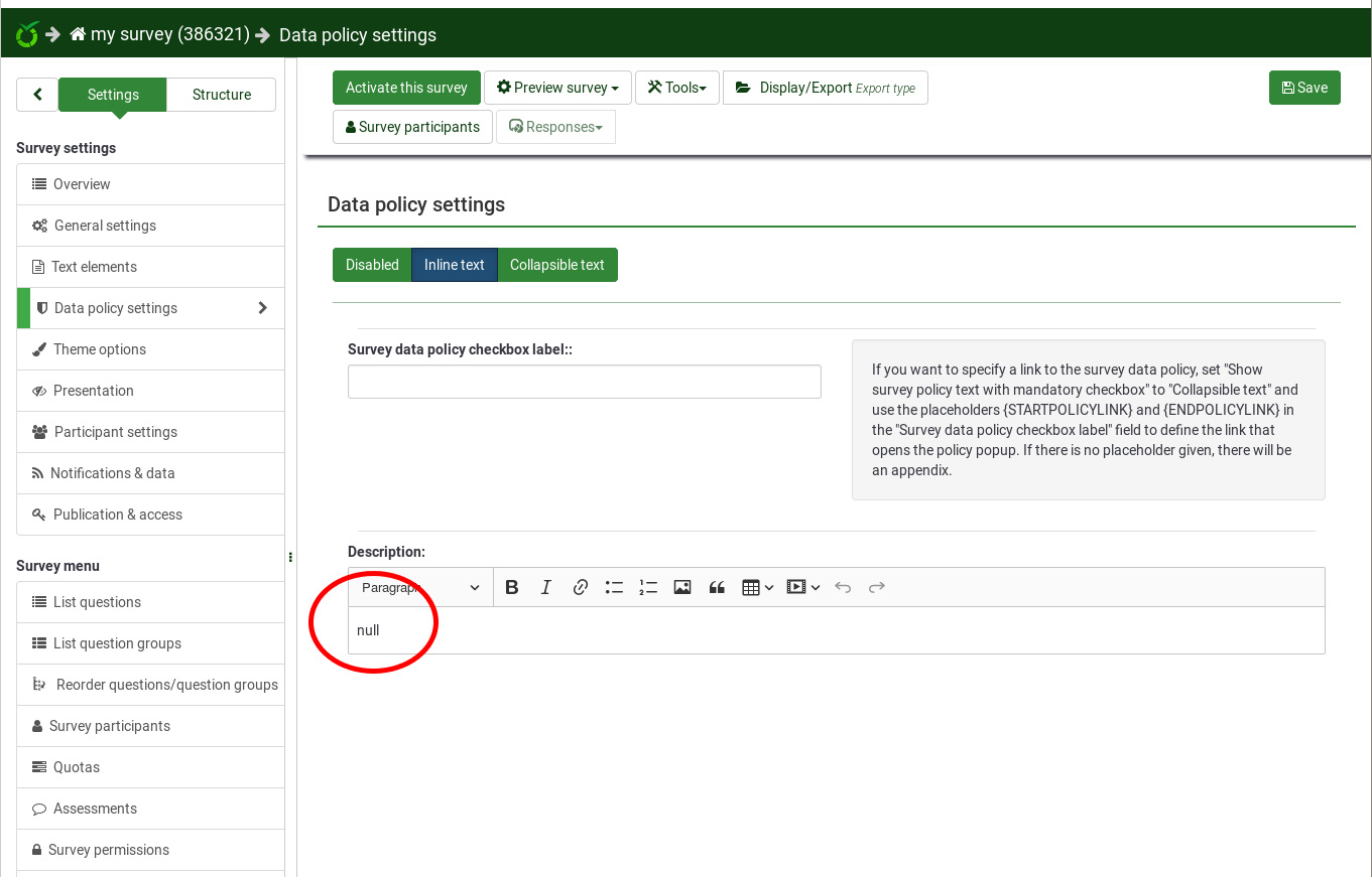 | Summary | 14807: Data policy description is "null", should be empty string? | ||||