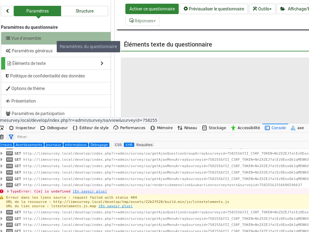 | Description | When try to editing Survey text (1st time) : js broken | ||||