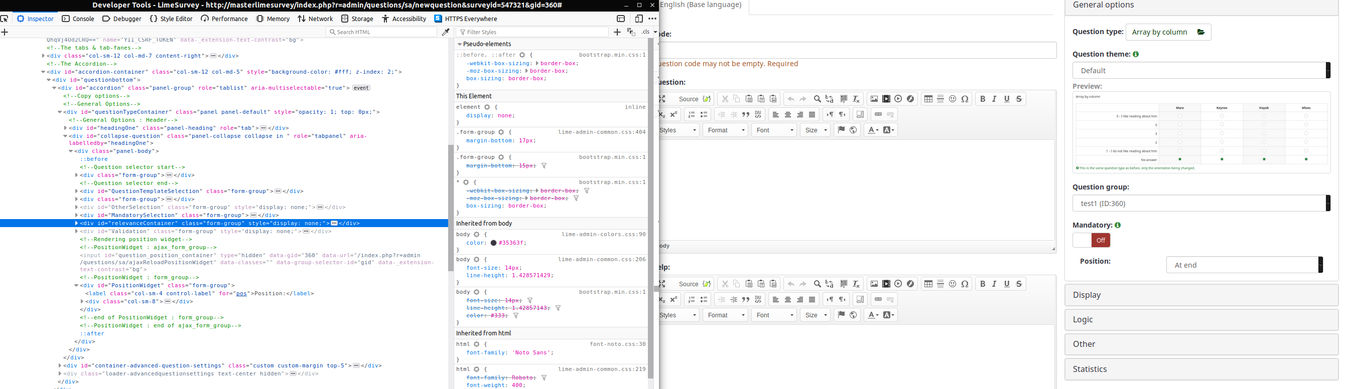 | Description | The validation and relevance fields are hidden (question type: array by column). Is there a reason for that? (see screenshot) The relevance field seems to be working (did a couple of tests; i deleted the css that hides it). | ||||