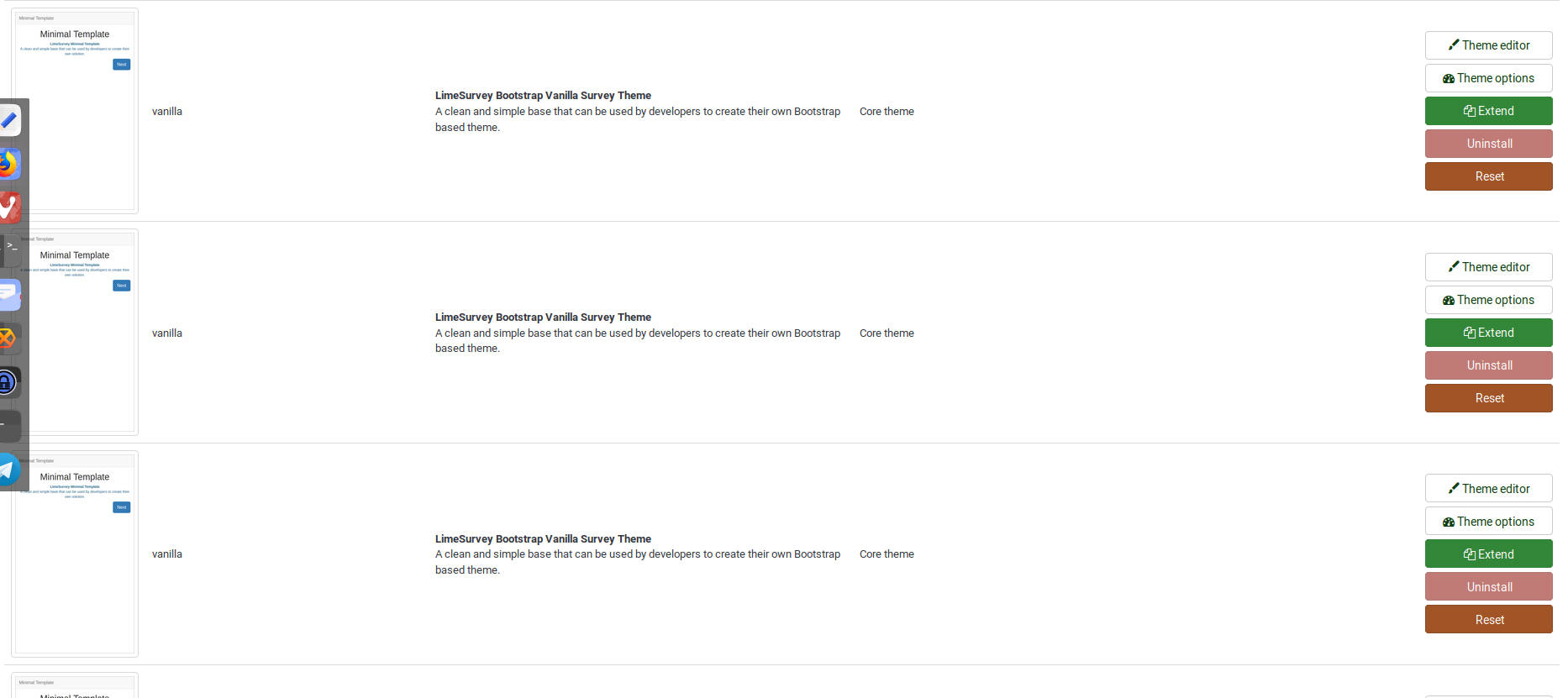| Description | It is possible to extend the core theme and use the same core theme name. Once done, I get multiple duplicates (see screenshot). I can set up different settings for each core theme. However, there is only one core theme displayed in the survey theme dropdown list (inside the survey). | ||||