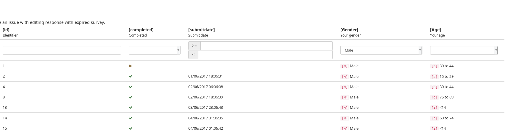 | Additional Information | It's implemented in https://gitlab.com/SondagesPro/managament/responseListAndManage Sample : https://demo.sondages.pro/plugins/direct?plugin=responseListAndManage&sid=423356 I think this part (column type for search) must be in Question Object when it's done | ||||