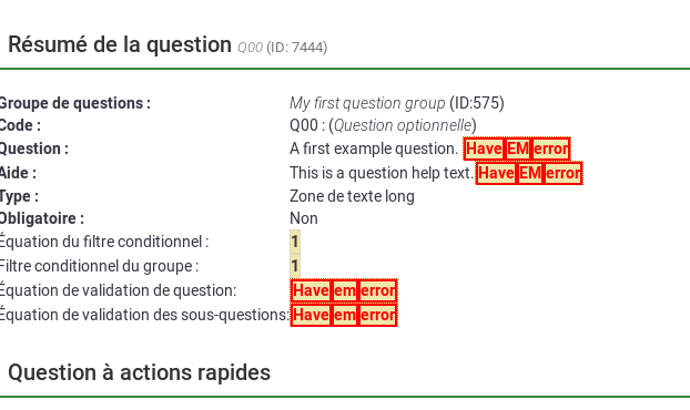 | Description | In 3.X and before : question quick view show question text + no language settings. If there are expression error : it's a good way to check it. | ||||