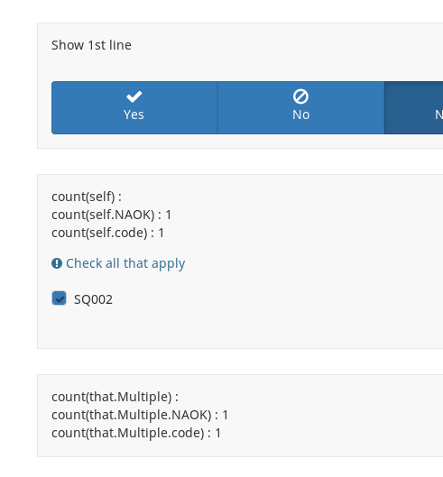 | Steps To Reproduce | Import included survey, test. You can check with js deactivated in 1st question … | ||||