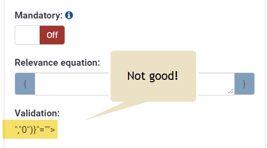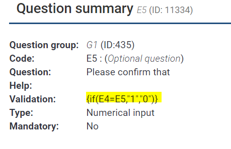 | Description | I put this in the Validation field of a question: {if(E4=E5,"1","0")} and then saved the question, when I return to edit the question, only part of the validation code is shown, and it is unedit-able. See attached screen shots | ||||