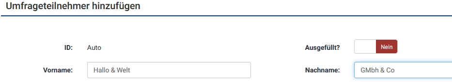| Description | If survey participants add firstname, lastname or more attributes like company names with an ampersand (&), this will be translated for example into “&”. | ||||