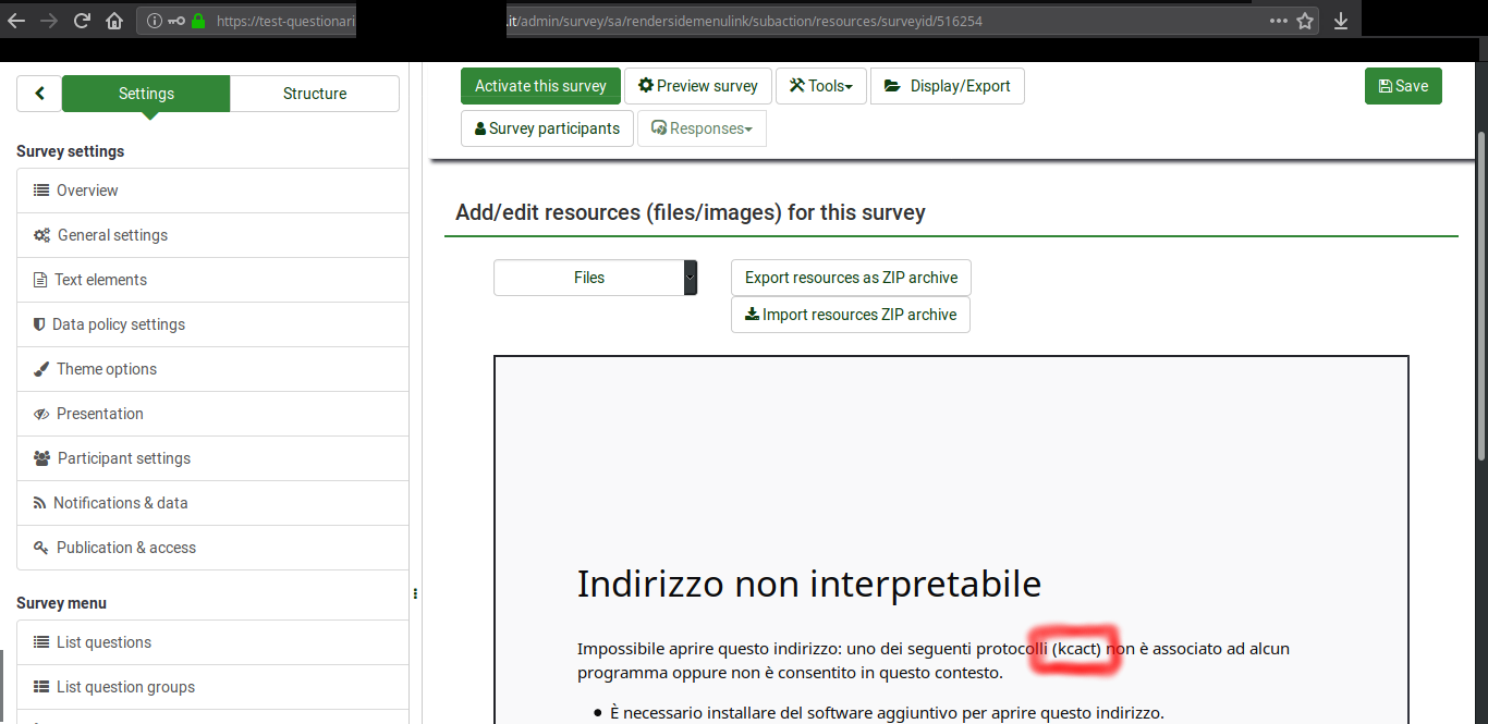 | Description | Ciao, It happens Inside survey's «Resource» page, and trying to upload attachments in email templates. The result is the applet gui is loaded but it's empty (no Files directory) and when you click any button (for example Reload) it breaks giving back the protocol error (using Firefox). | ||||