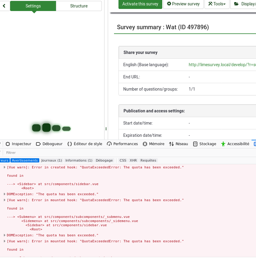| 2019-07-23 13:11 | DenisChenu | Summary | No surveys menu => No surveys menu : Local Storage QuotaExceededError: The quota has been exceeded. |