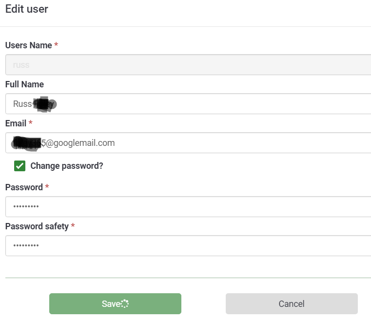| Description | When creating a user and then changing the user's password and clicking "save", the progress icon keeps turning but no "Password saved" message or the like shows up, see screenshot. | ||||