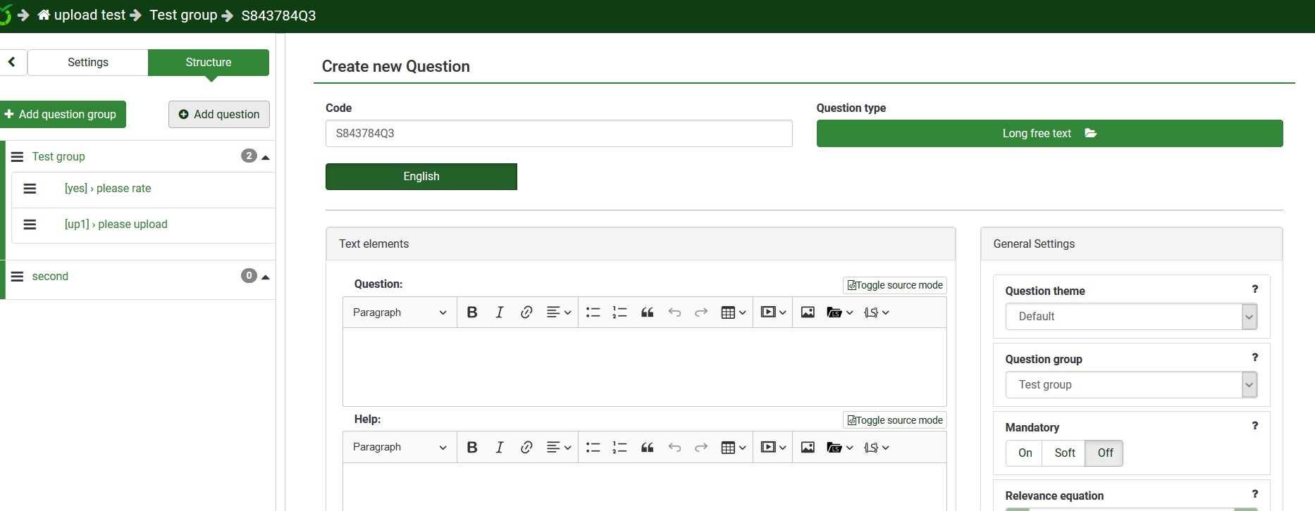 | Description | Depending on the cursor position on the left navigation, when you add a new question it might give you a page that has no option to save the question you are adding. It is reproducable, but hard to be specific as to where the focus is when this occurs. This occurs when clicking the "add question" button. Try setting the cursor focus in the left navigation, but not selecting a specific group. See the attached screen shot. | ||||