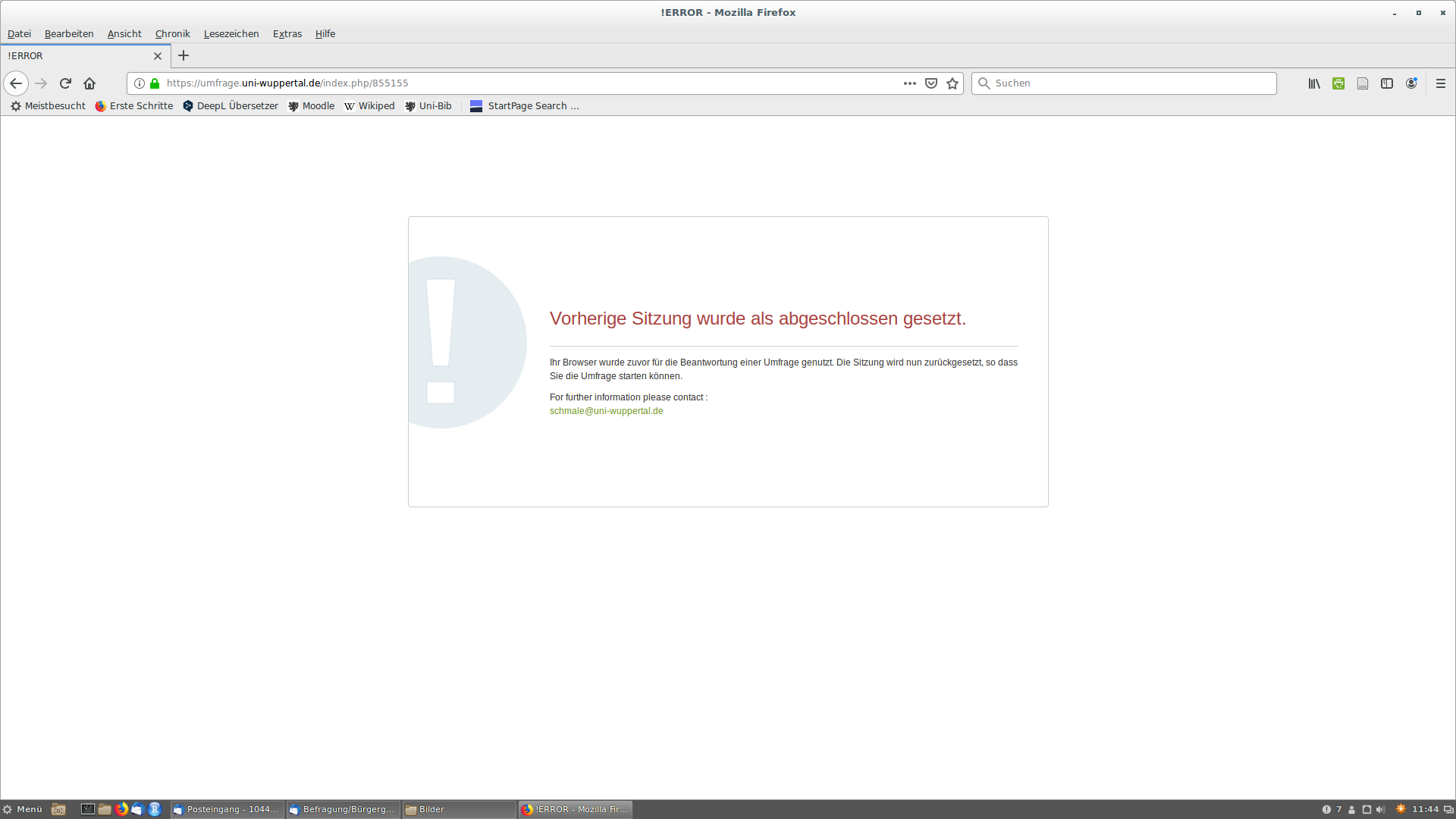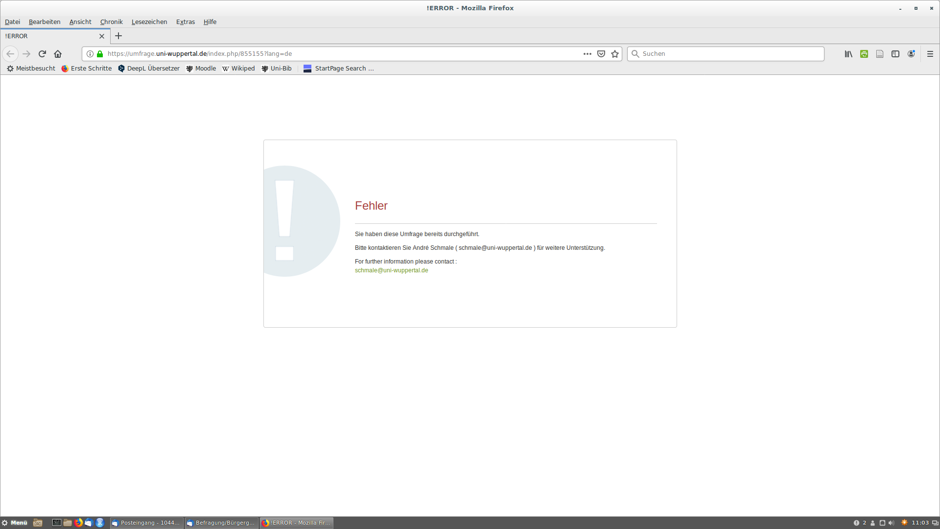 | Steps To Reproduce | active: inactive: try to use the survey in the following way: execute survey !ERROR that is wrong, the answers are collected and thereon the users are irritated and if they will start over they get "Bildschirmfoto_1.png" | ||||