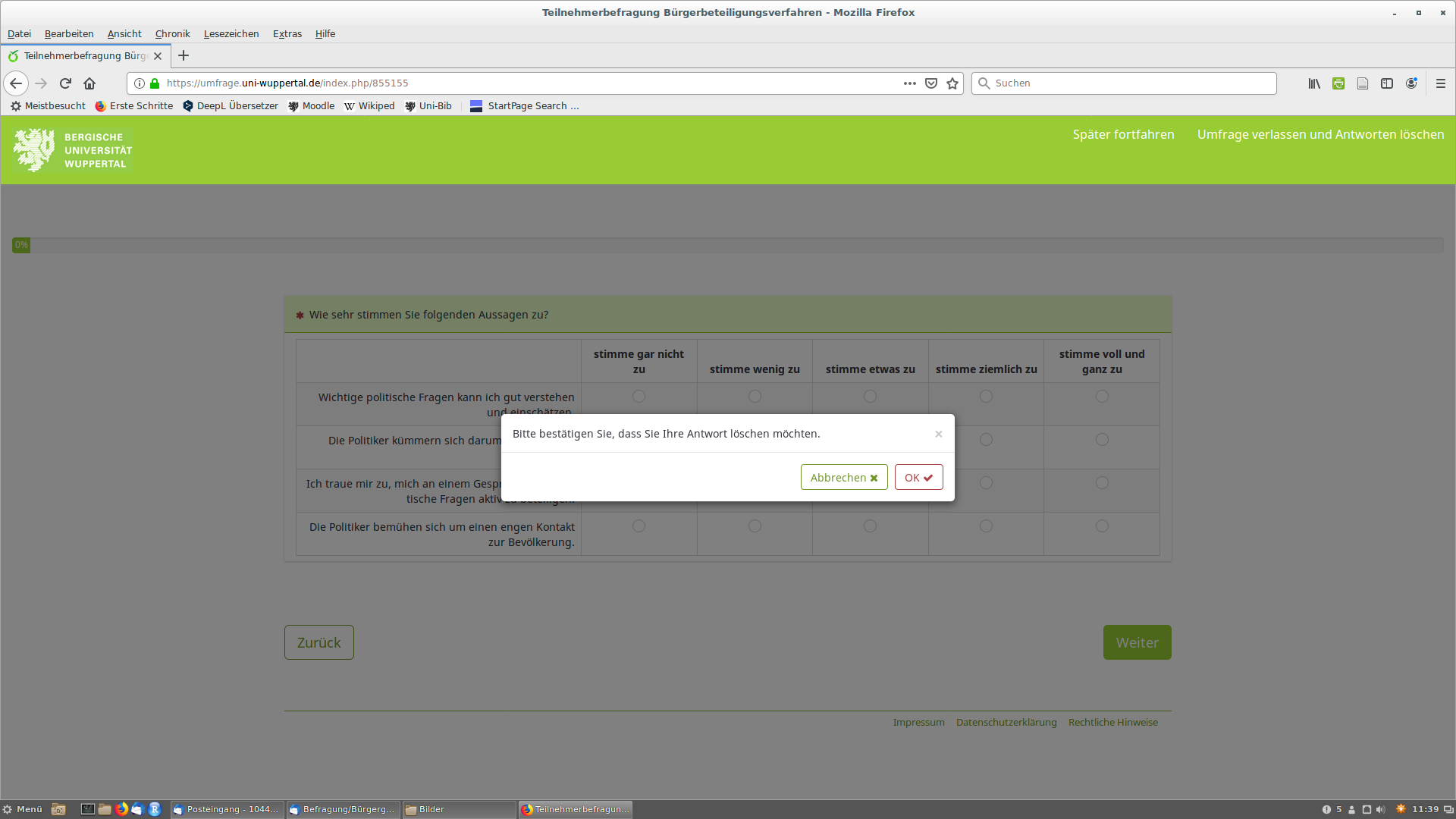 a) Nachdem ein externer Teilnehmer der Umfrage gemeldet hat, dass er Wenn man die Umfrage abgeschlossen hat und erneut aufruft, erhält man Bricht man die Umfrage jedoch ab, über das Menü "Umfrage verlassen und Da dieser Teilnehmer schrieb, dass er die Umfrage abgebrochen und neu | ||||