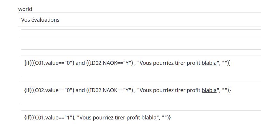| Description | In a questionnaire with evaluation, I entered evaluation rules of the following type: Everything worked perfectly on a version of lime survey prior to 3-15-5-build-181115; | ||||