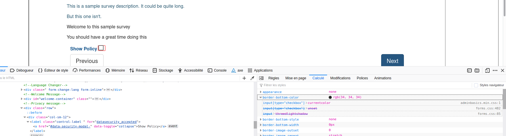 | Description | When you have a theme without css for Show policy checkbox, it still use the LimeSurvey admin checkbox | ||||
