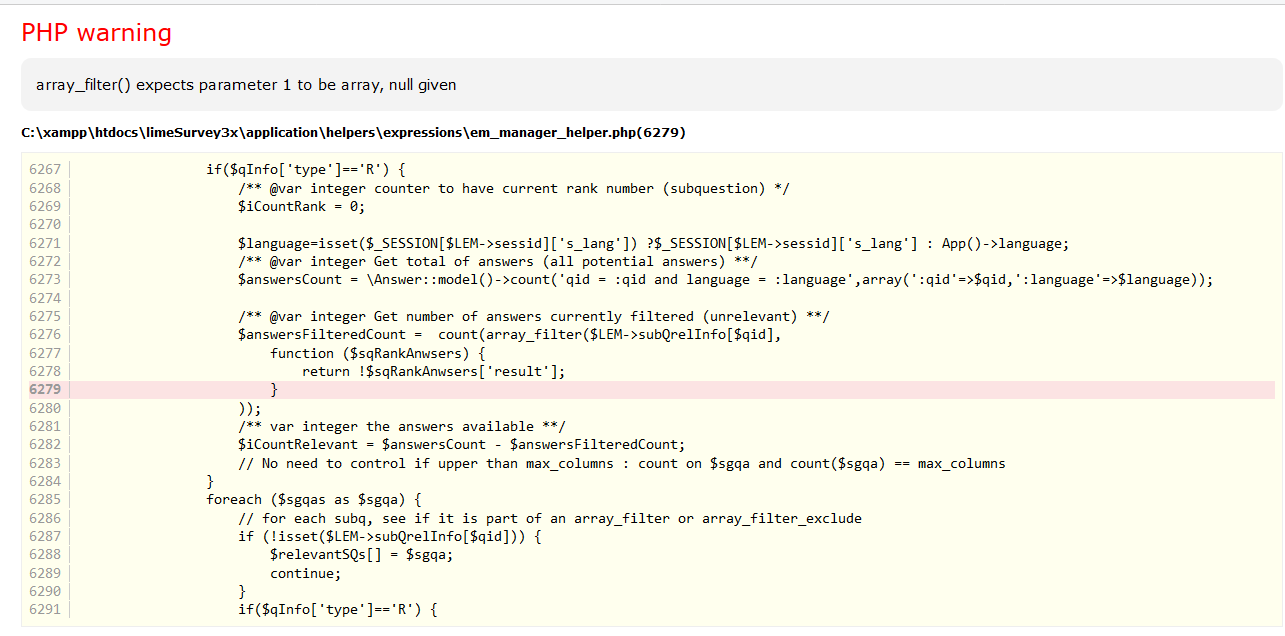 Yes, and the last issue happen ONLY with debug > 0 The original issue happen with debug == 0 Original issue fix : https://github.com/LimeSurvey/LimeSurvey/commit/f441cd5c53bd9c19ae8d027b2ae0b8905b44db50 |