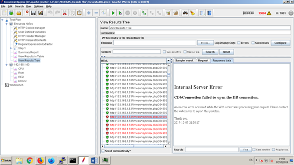 | Description | Me encuentro realizando pruebas de carga a una encuesta de 10 preguntas con la herramienta JMeter en la cual genero varias peticiones en el proceso de llenado de la encuesta, al generar 1000 peticiones el mensaje "cdbconnection failed to open the db connection" aparece en la herramienta JMeter, alguna recomendación, configuración adicional para que las pruebas de carga funcionen. La instalación se encuentra localmente . datos de servidor Versión de LimeSurvey | ||||