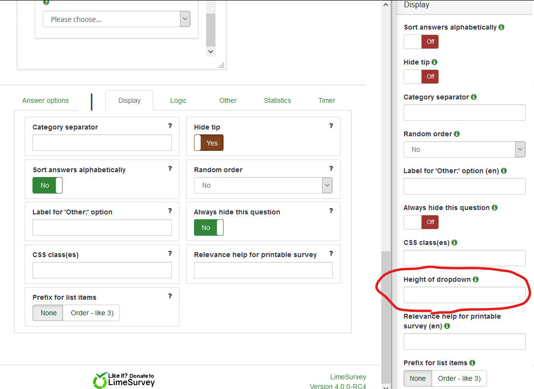 | Description | The question attribute "height of dropdown" is not available in LS4. That means that no scrolldown lists (dropdowns with all fields visible) can be done. | ||||