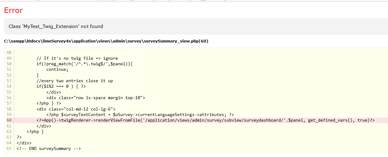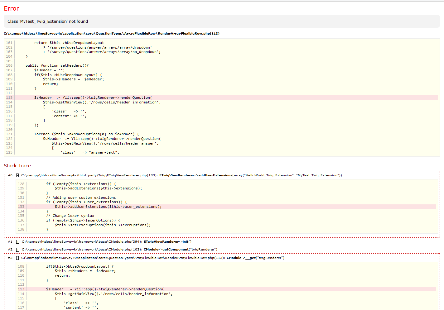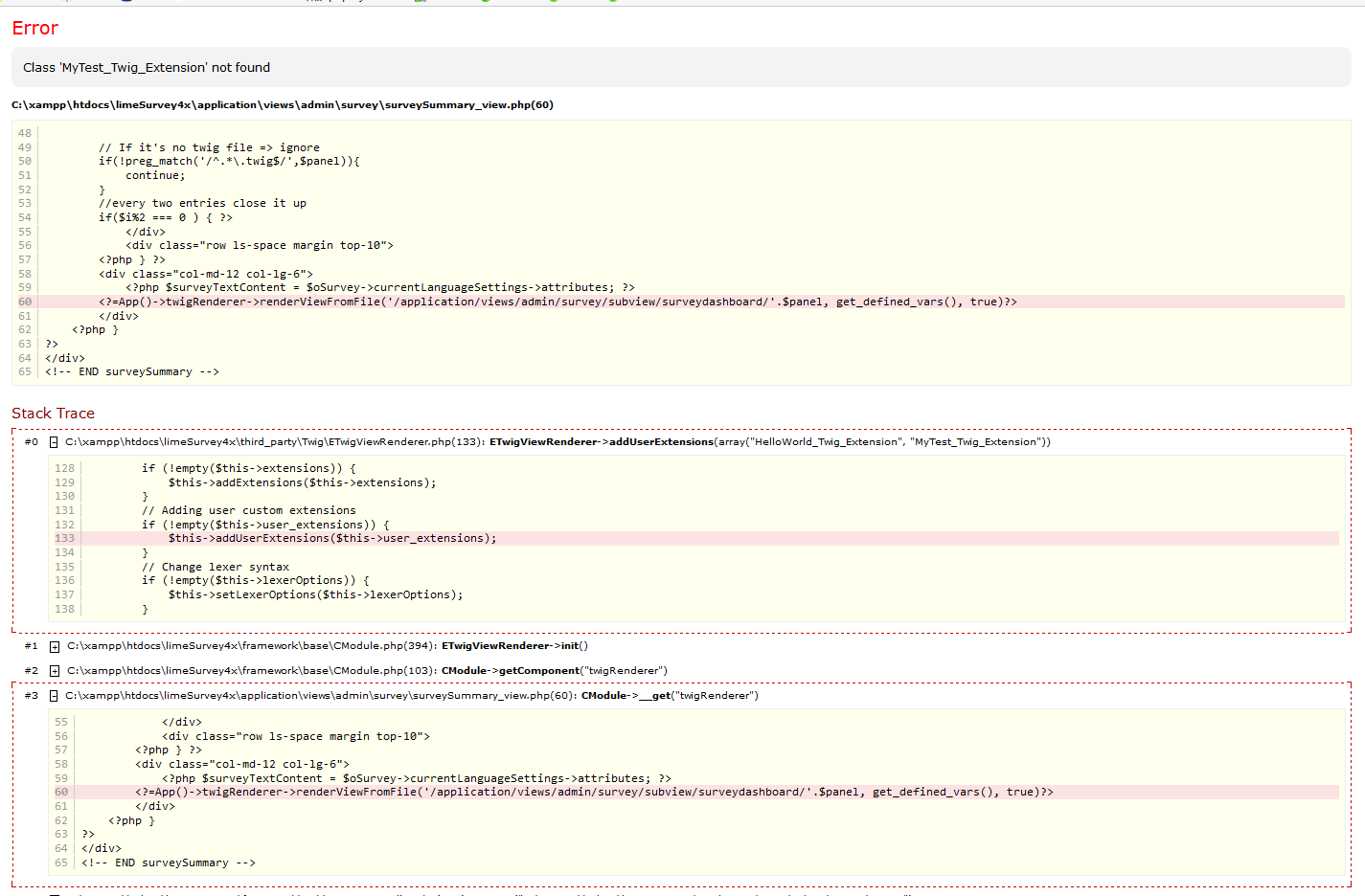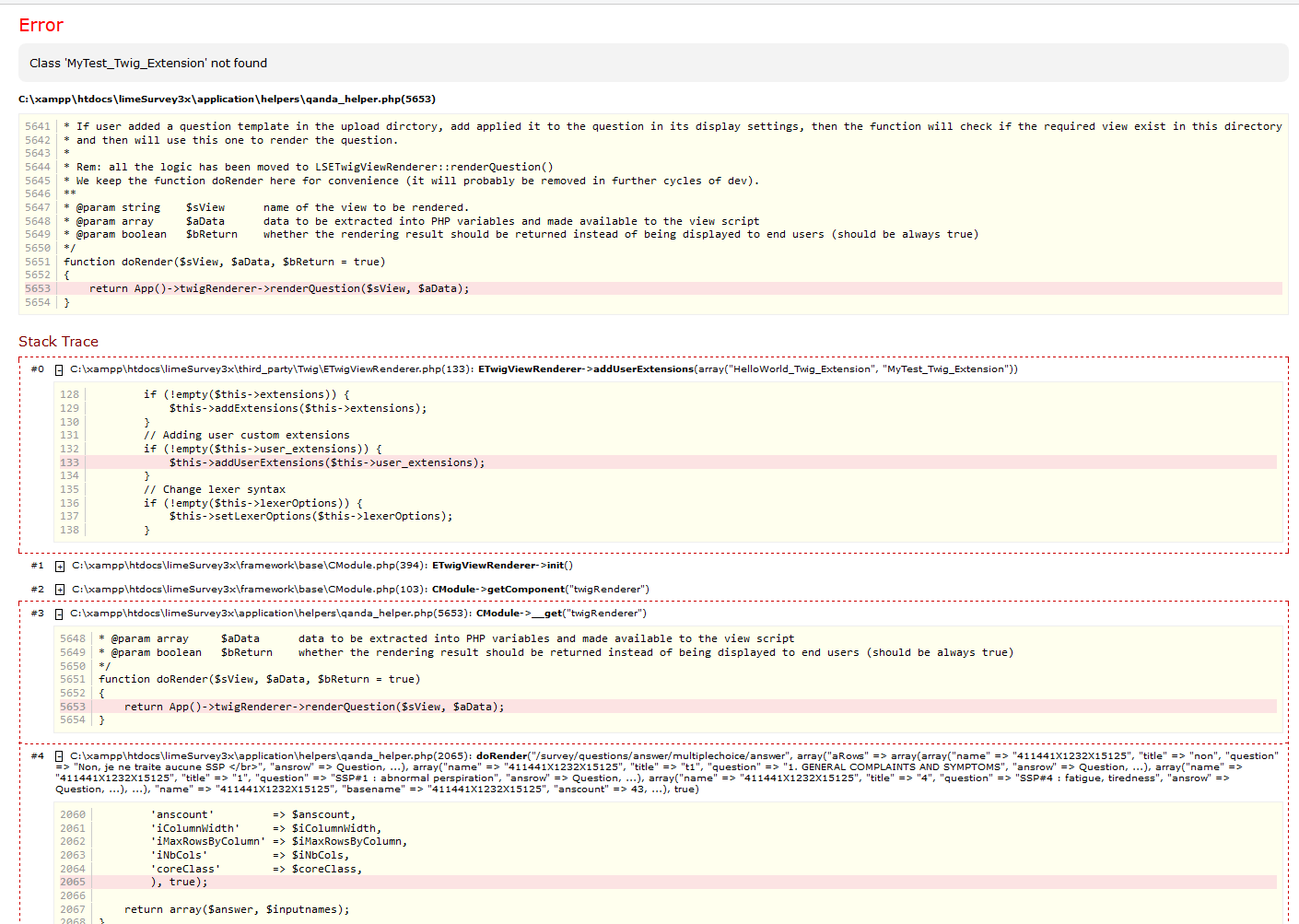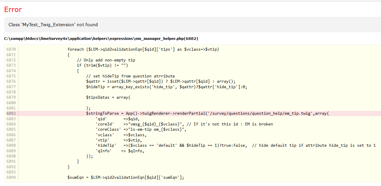 | Description | I copied the existing HelloWorld_Twig_Extension file in ./upload/twig/extensions, simply changing all instances of "HelloWorld" with "MyTest", which should have given me access to a new TWIG function MyTest(). The result in the back end is seen in the attached bug_11_backend.png. The result in the front end for all surveys is seen in bug_11_frontend.png. I have also attached my test extension file - MyTest_Twig_Extension.zip. | ||||