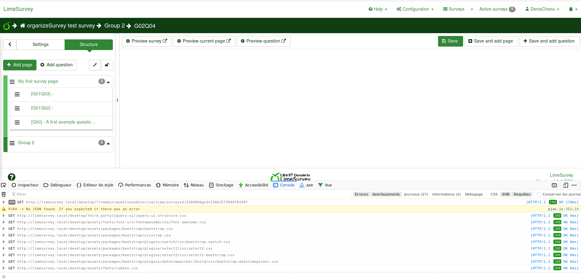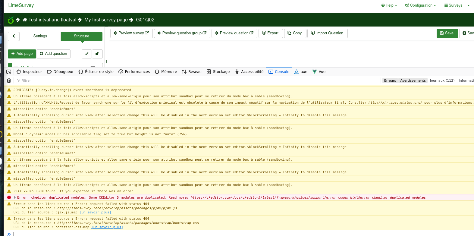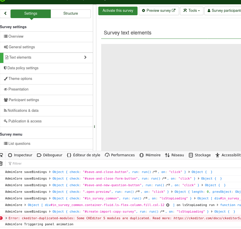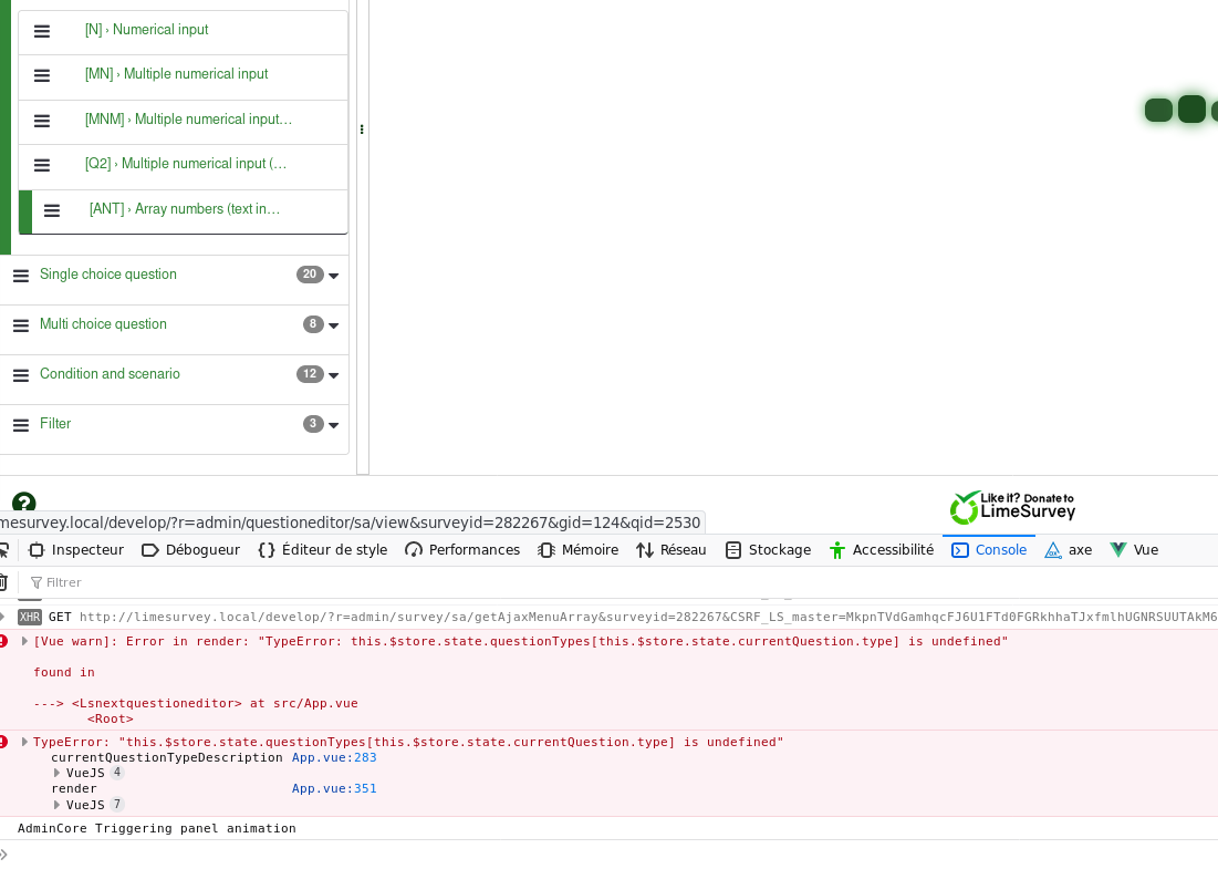 72.0.1 (64 bits) (Fedora version) Privacy on strict mode Els e: it don't happen the 1st time : import survey : go on MULTI, go on checkJs , go on checkPHP Seems VueJS are not updated |