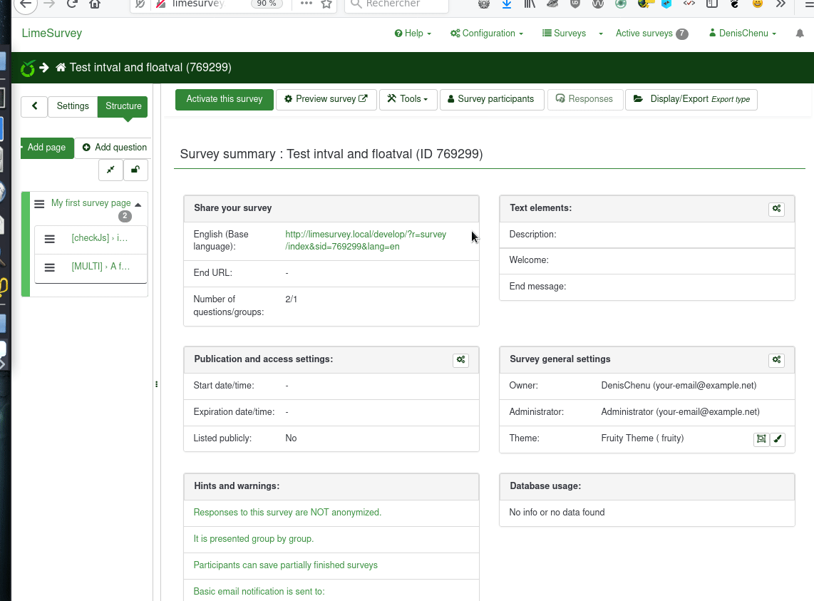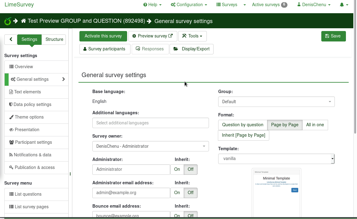 | Complete LimeSurvey version number (& build) | 4.0.0-RC6 git fe43804ec0 | ||||