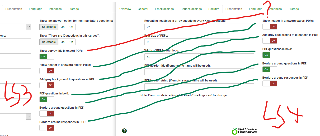 | Summary | 15552: no option "Show survey title in export PDFs" | ||||