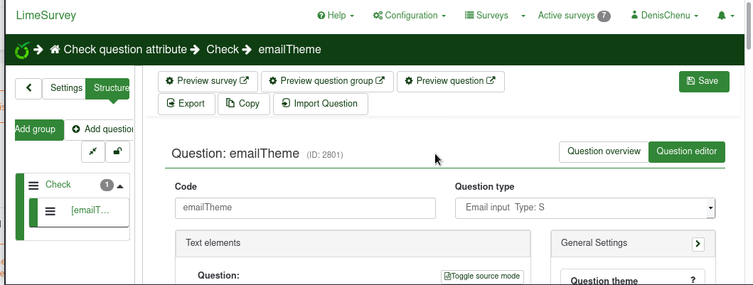 | Description | When using a custom question theme with custom attributes, they are not available in the GUI. See this screen-cast which shows both LS 3.x and LS 4.x - https://screencast-o-matic.com/watch/cqXbotU3K4 | ||||