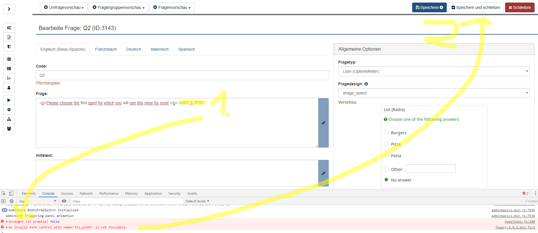 | Additional Information | When I use question type "list(options)" and select "image_select" I can create my question for the survey. in debug console of firefox there is a lot of logging. But I have not turned on logging in my backend of limesurvey. | ||||