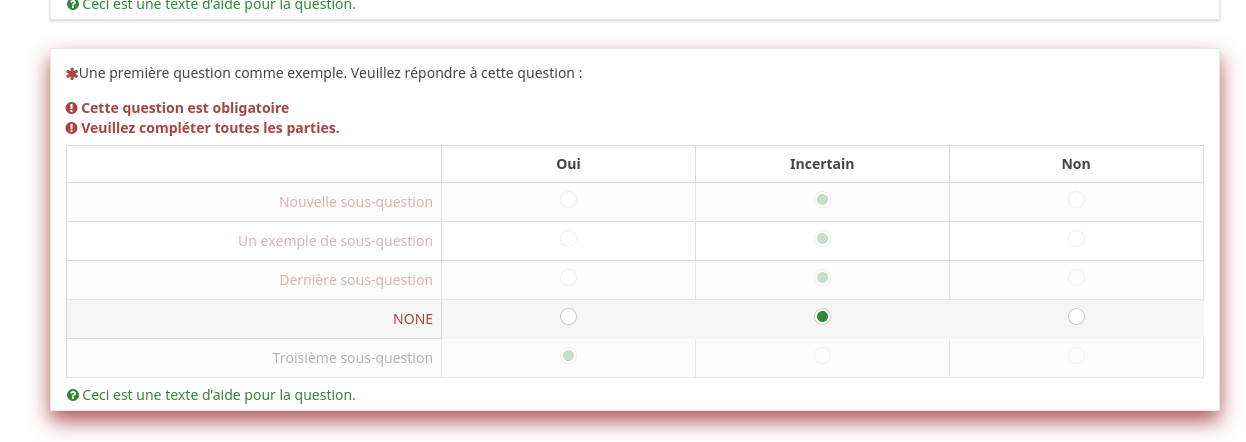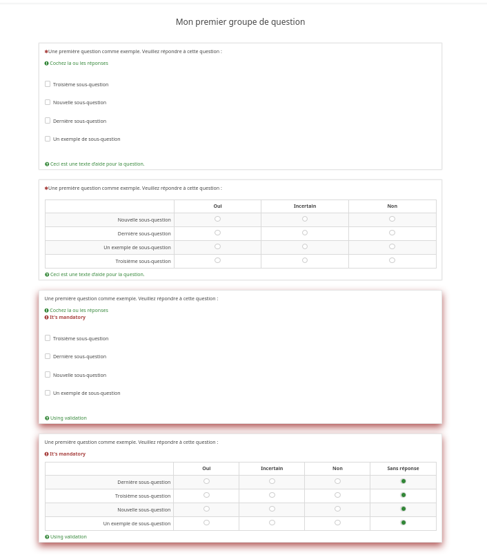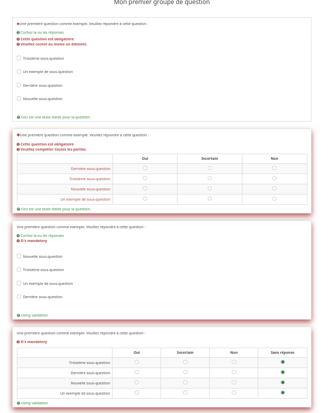 | Description | When not answering a mandatory array question and clicking next, the not answered question gets highligjted with a red border, see screenshots. | ||||