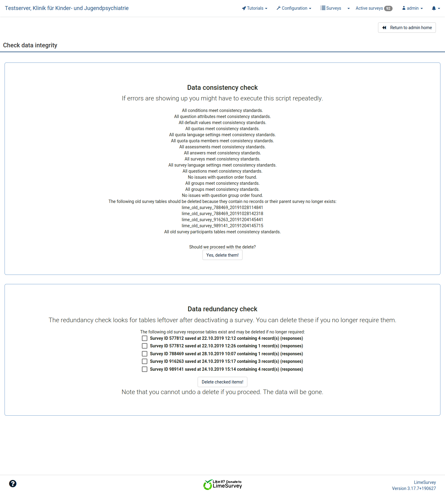 I cannot send you the whole database, the survey responses contain patient data. I will remove the survey responses from the dump and if the problem still exist, than I send you the cleaned database. But give me some time. |