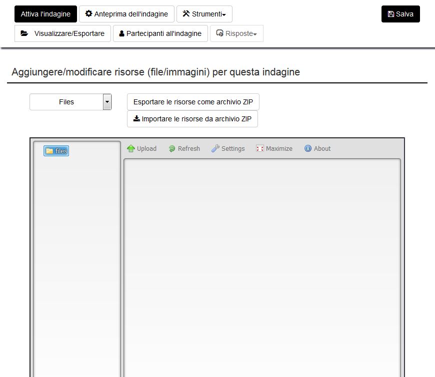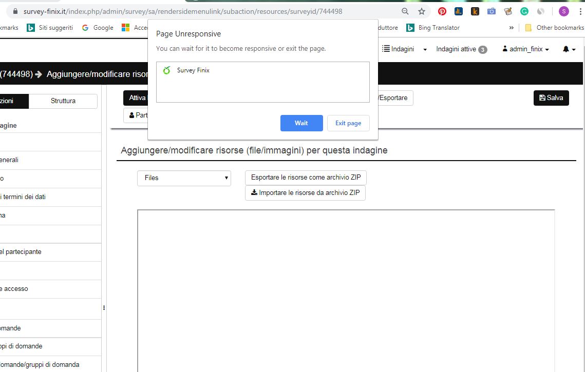 Well, I have tried with a survey that is not active, and it doesn't work either. I have tried with Firefox and the page loads. Files can't be uploaded, though |