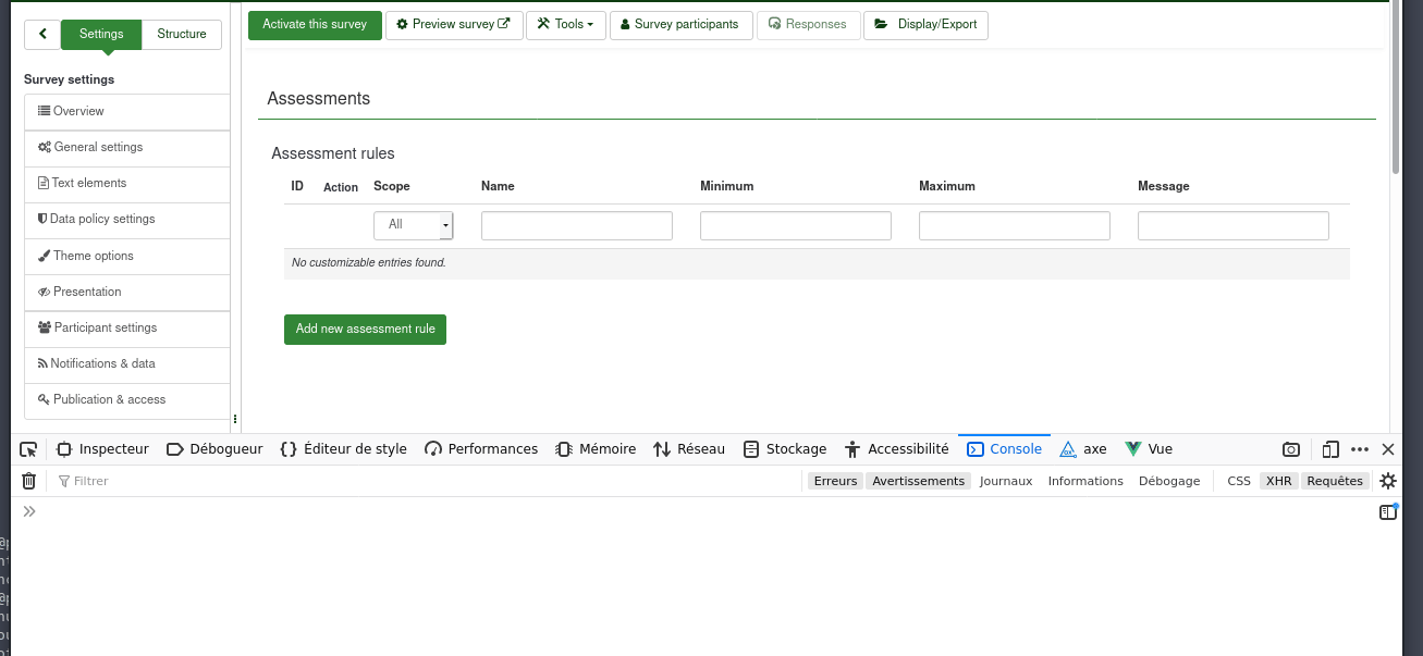 | Description | When i try to create assesment : error in js console and nothing happen | ||||