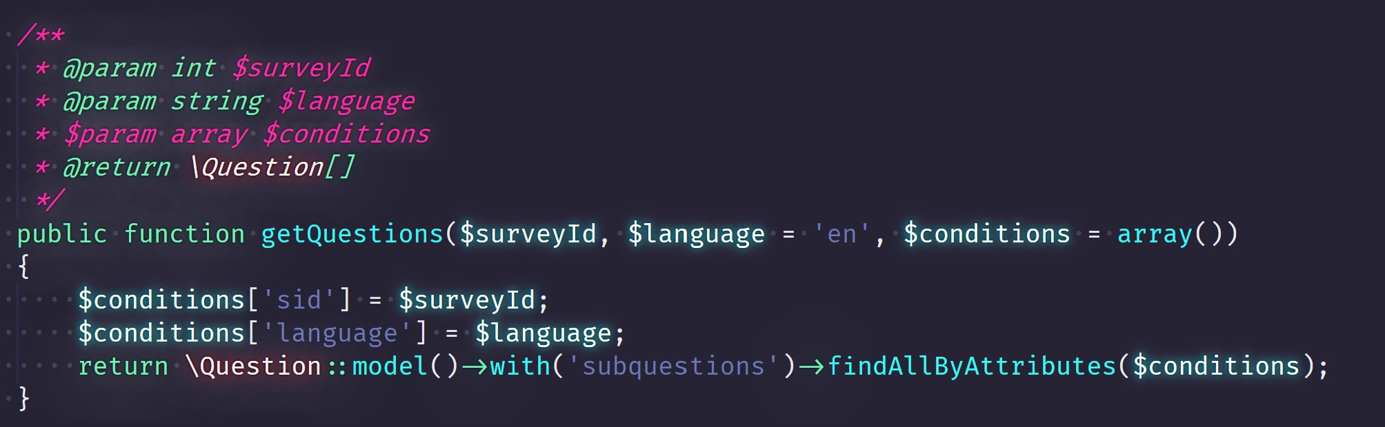Hello Denis, thank you very much for your answer. If i understand you correctly, there is already a function at the LimsurveyAPI called getQuestions, which is working fine if i comment out the conditions line regarding the language. I attached you the function in the limesurveyAPI i'm talking about. In your Github link its the line https://github.com/LimeSurvey/LimeSurvey/blob/71898e9d27fbfe439ecd685cdf100f4d2118e908/application/libraries/PluginManager/LimesurveyApi.php#L400 Thank you very much for your time! |