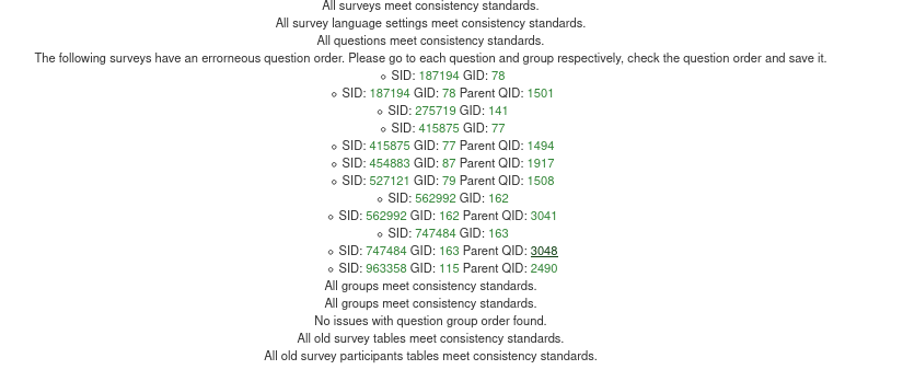 Mmmm … Maybe don't show the line if survey is activated ? Or show a second part with "This survey is activated , you can not fix it but there are issue" Else : Parent qid link : goes to old subquestion editor : no save button, no way to fix /admin/questions?sa=subquestions&surveyid=187194&gid=78&qid=1501 |