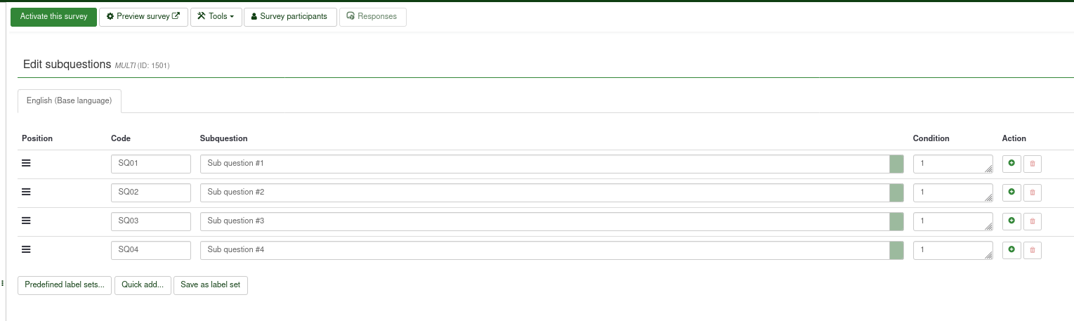 | Additional Information | For subquestion : since survey is activated : no way to reset order + old link of subquestion mamanagemnt | ||||