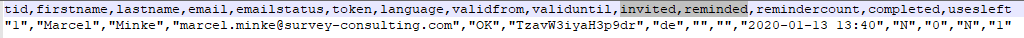 | Description | Token export file uses "invited" and "reminded" as column names for invitation and reminder sent dates while at the DB it actually is "sent" and "remindersent", see screenshots | ||||