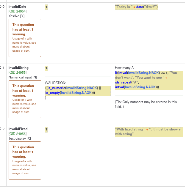 The warning show with function and + operator are always «Usage of + with numeric value, see manual about usage of sum.» and never «Usage of + with string value»