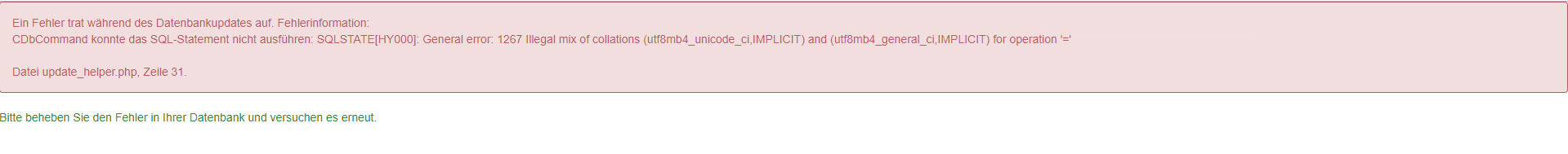 Hello, we have exactly the same problem here. After the update files have been copied, you can update the DB. Then came the error: An non-recoverable error happened during the update. Error details: regards |