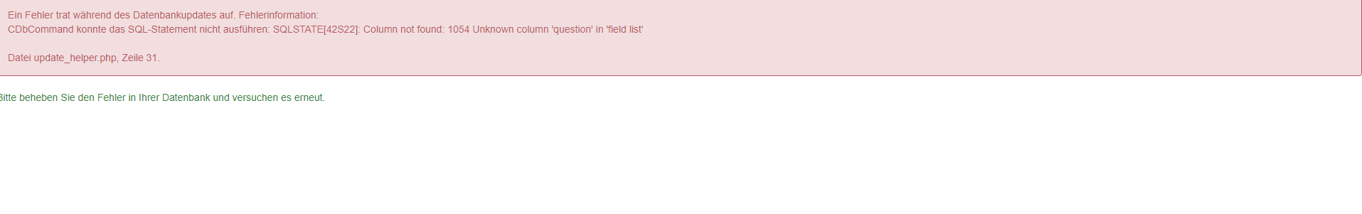 | Description | Hi, I have just tried to upgrade LimeSurvey to version 4.1. Unfortunately I cannot upgrade the database. I get the following errors: First error: An error occurred during the database update. Error information: Second Error: Ein Fehler trat während des Datenbankupdates auf. Fehlerinformation: See more in my screenshots | ||||