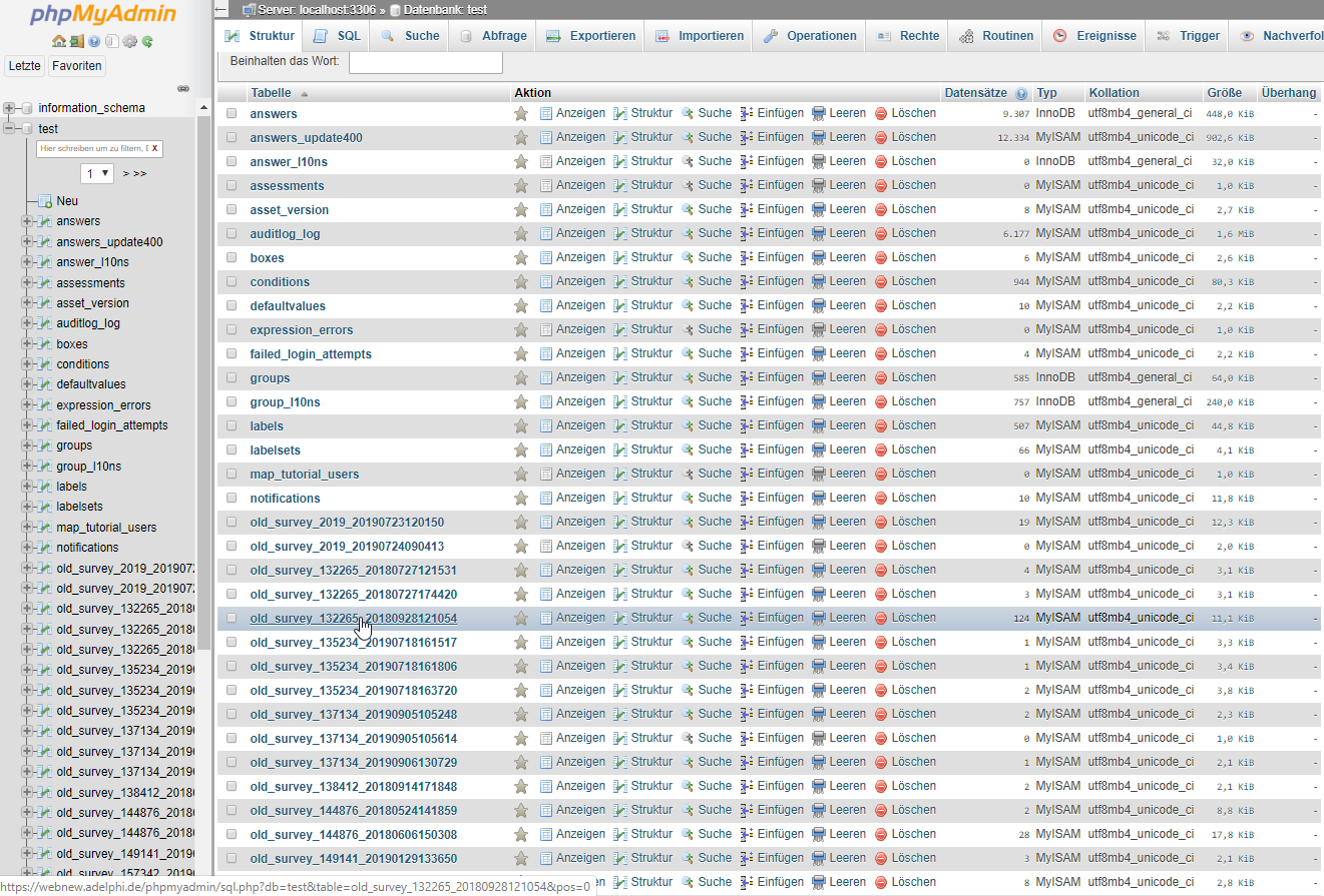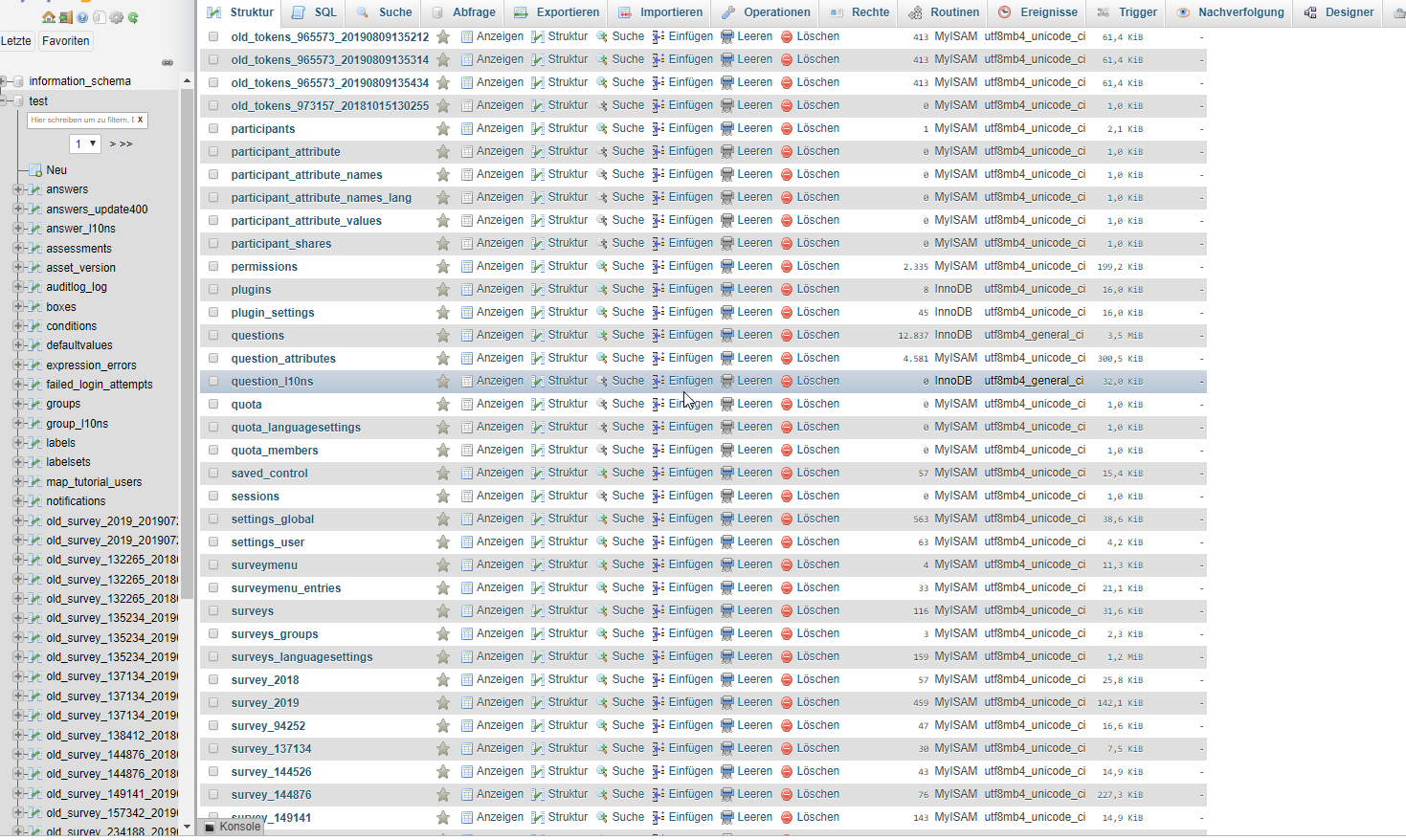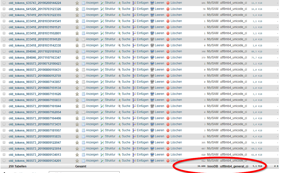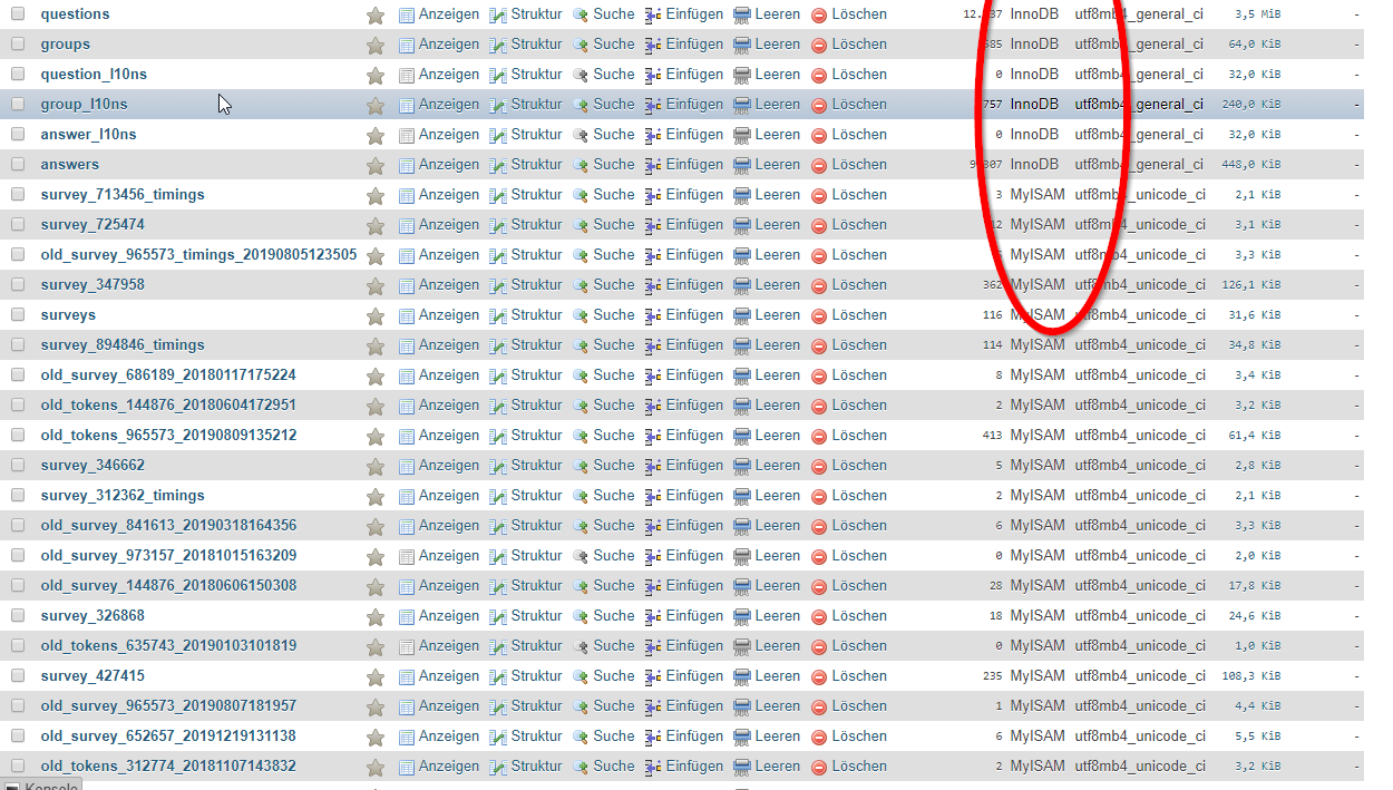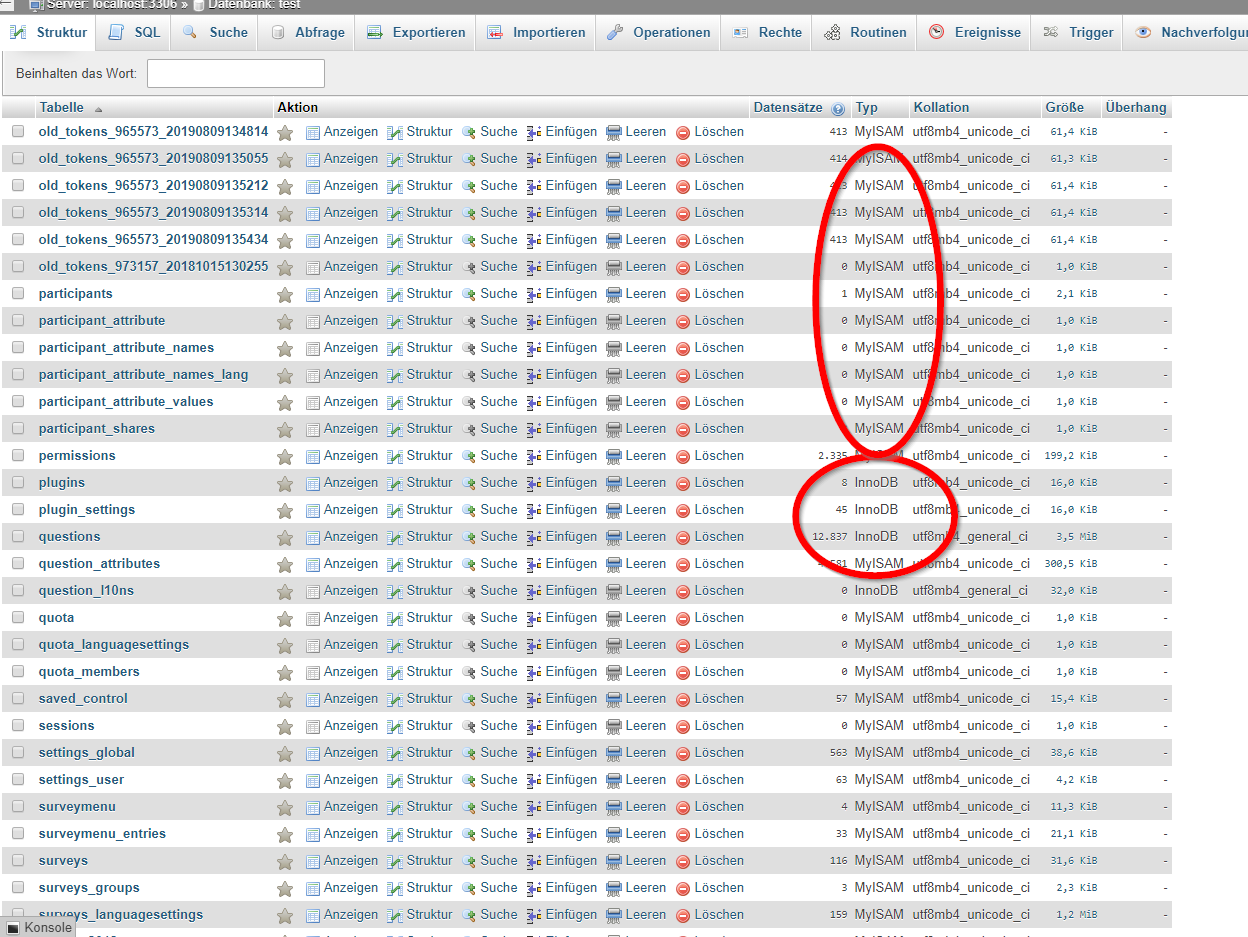 Alle Tabellen benutzen "utf8mb4_general_ci". Die Unterschiede sind beim Typ der Datenbank. Dort gibt es die Typen "MyISAM" oder "InnoDB". |