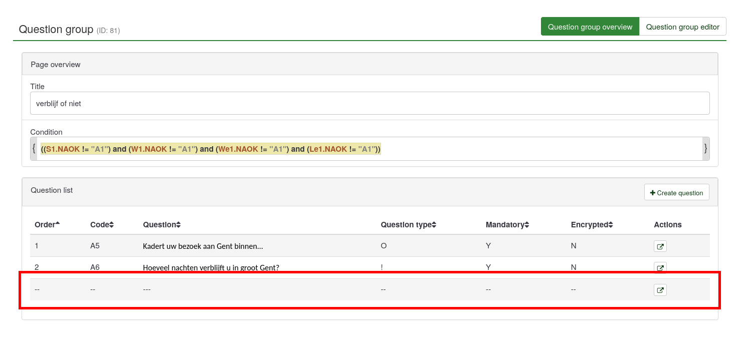 The group "verblijf of niet" should be shown. While the page is shown, the group is hidden. It seems like something goes wrong when evaluating conditions for these groups / questions in these groups. | ||||